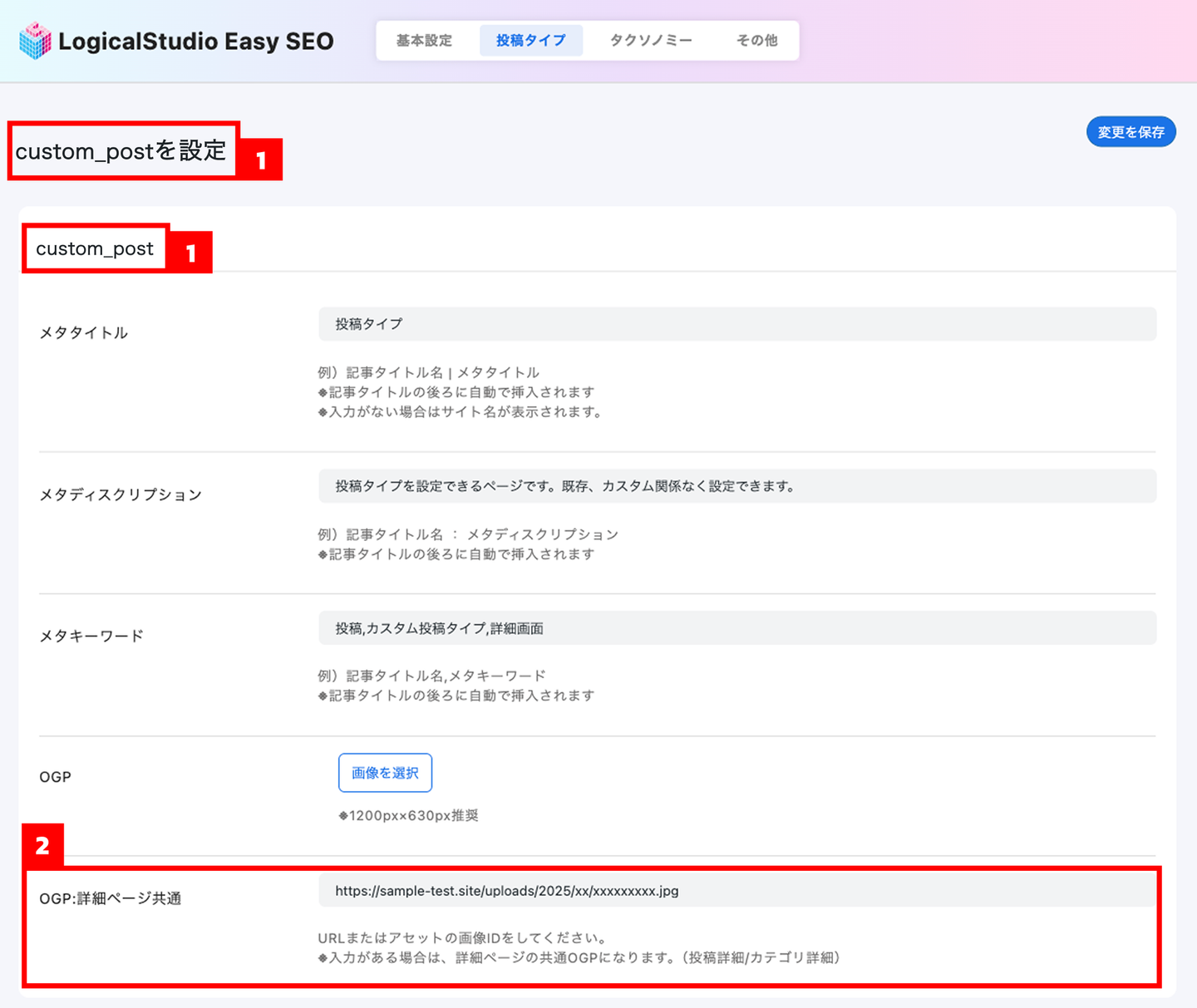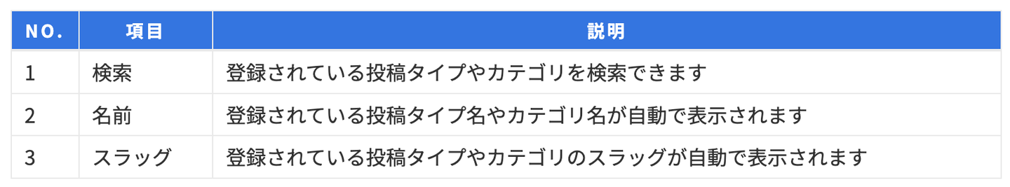 ※上記以外の項目は、基本設定の【2】〜【5】、投稿タイプの【2】と一緒です。