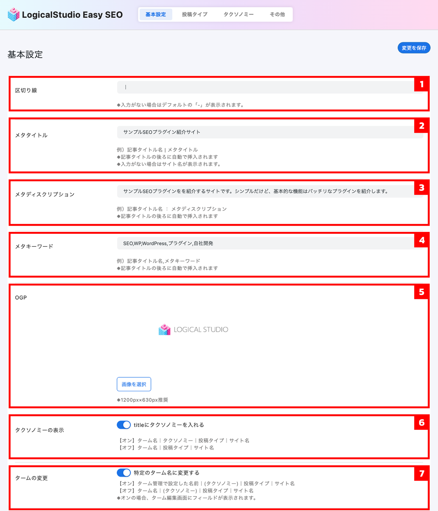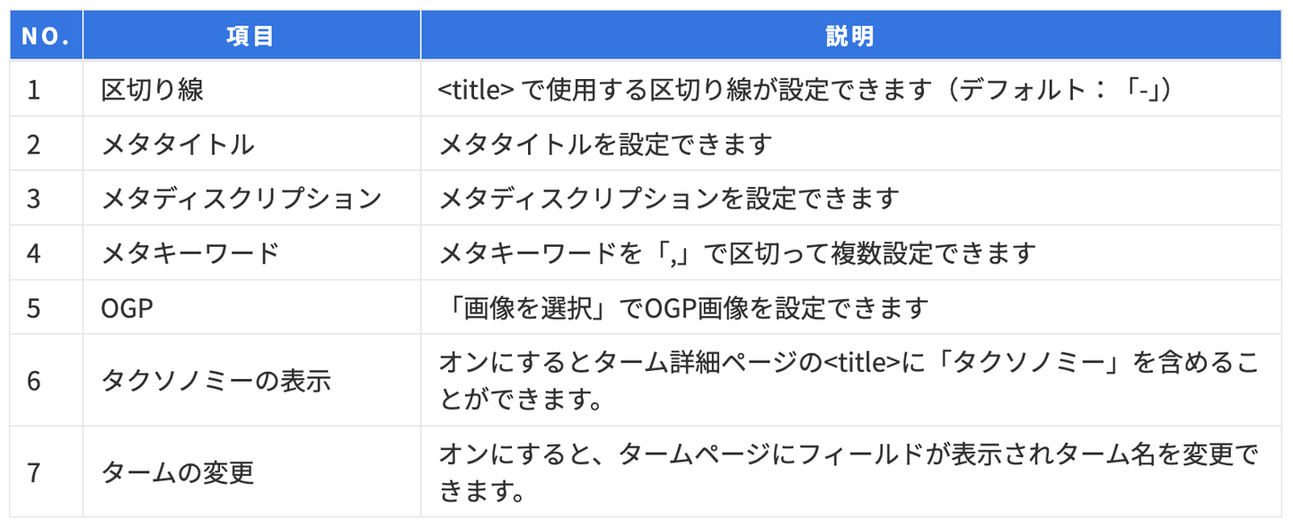 サイトの全体設定だけでなく、ページ単位で柔軟にカスタマイズできるため、「トップページだけ説明を変えたい」「カテゴリごとにメタ情報を変えたい」といったニーズにも対応できます。