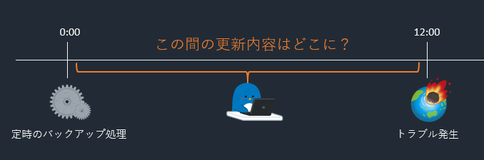 夜中の0時にバックアップを取った後、昼の12:00に障害が発生したとしましょう。