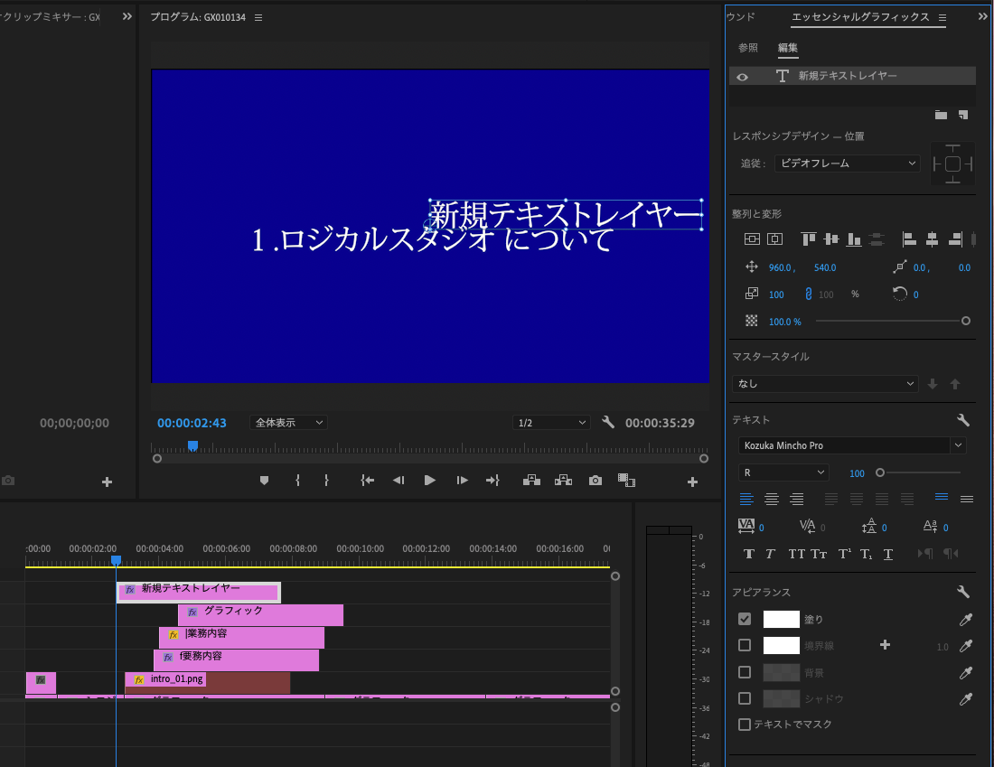 - タイムライン横のバーからテキスト、シェイプ作成が可能です。