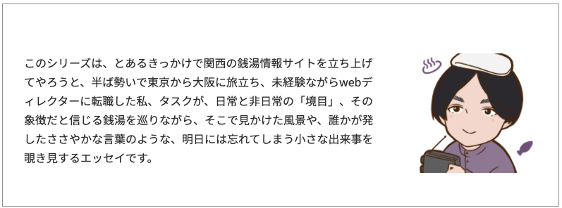 このシリーズは、とあるきっかけで関西の銭湯情報サイトを立ち上げてやろうと、半ば勢いで東京から大阪に旅立ち、未経験ながらwebディレクターに転職した私、タスクが、日常と非日常の「境目」、その象徴だと信じる銭湯を巡りながら、そこで見かけた風景や、誰かが発したささやかな言葉のような、明日には忘れてしまう小さな出来事を覗き見するエッセイです。