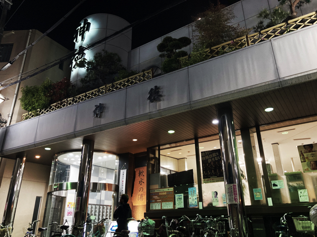 旅館のような外観。21世紀の公共浴場と銘打たれる「神徳温泉」で、春ならではの緩みを締めることにした。ロビーは広く、奥にカウンター型の食事処や飲食スペースがある。おつまみや飲み物も充実していて、1日を過ごしてもいいくらいだ。ここでリモートワークさせてもらえないだろうか、とはいえ今長時間滞在するのは、と思い、諦める。とにかく早く収まってくれと切に願いながら、券売機で購入したチケットを、番台でお風呂セットに交換してもらい、脱衣所に向かう。外観からして、相応の広さを想像していたが、中はこぢんまりしている。壁2面がロッカーで、反対側は大きな鏡台。昔ながらのマッサージ機も設置されていて、どことなく懐かしさがあったが、浴場に入った途端、そこは21世紀であった。