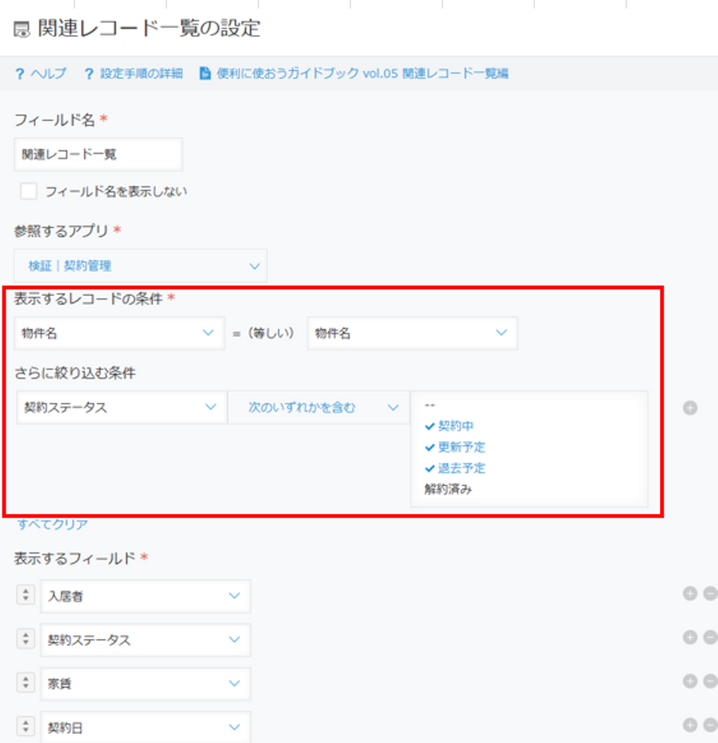 関連レコード一覧フィールドは、物件名が一致し、契約ステータスが「解約済み」以外のレコードを表示するように設定しました。