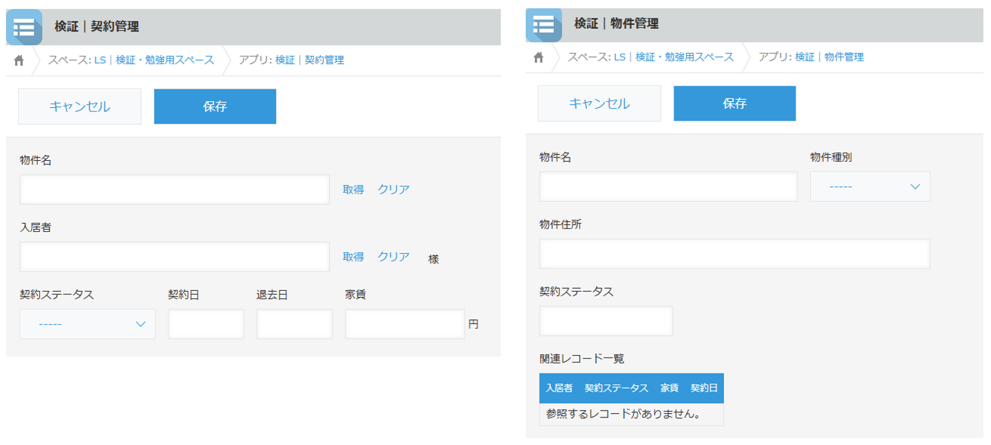 - 物件管理アプリ:物件名や住所に加えて、「関連レコード一覧」フィールドを設置。
