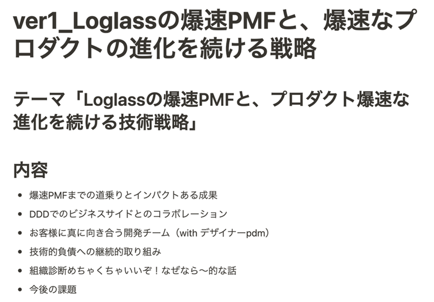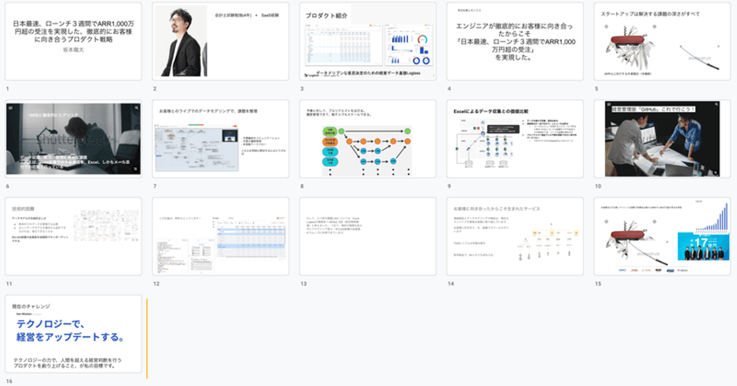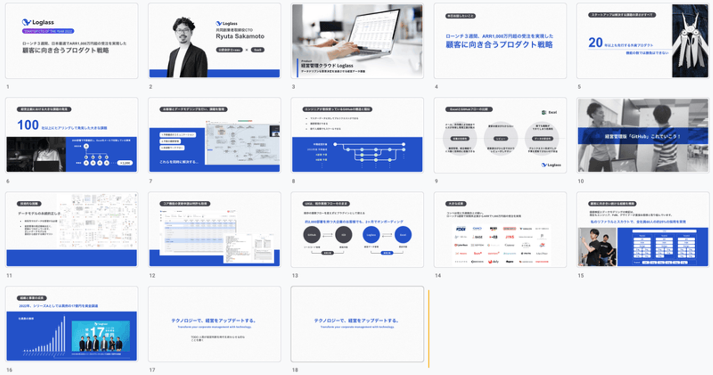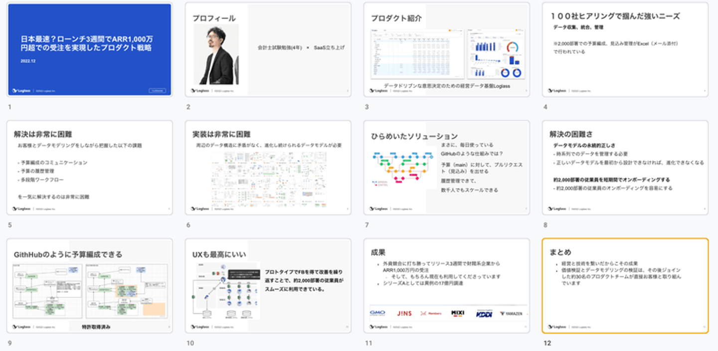 “あらゆる方面で正しいことを地道に正しくやってきたこと”がログラスの真の強みで、誇れることだが、どう伝えようとしてもCTO of the yearに選ばれる内容には思えない。 技術的難易度、技術についての内容が非常に希薄である。Loglassの技術について適切な角度で、丁寧に、お伝えすることが出来ていない。 一次FB会で、お互いの手の内を完全に知る 本番一週間前、ユーザベースさんのオフィスで、登壇者全員、AWSの方、プレゼン指導の 前田 鎌利(マエダ カマリ) さんの前でプレゼンをし、FBを頂く機会がありました。
