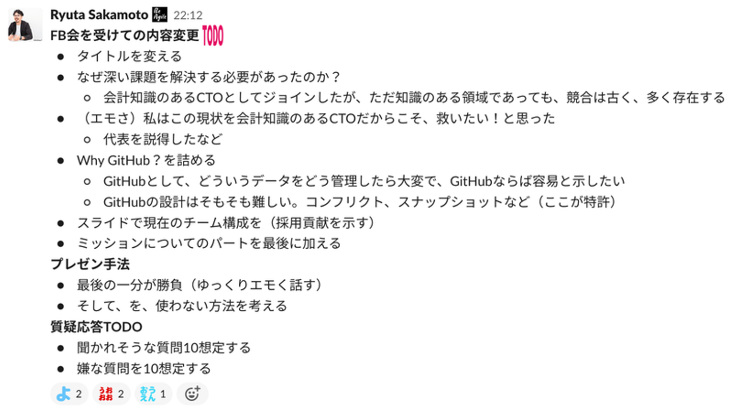 内容について ストーリーの醍醐味である、どうしてGitHub的なソリューションなのか?が、全然伝わらない。 「ARR(年間定常収益)で示すよりも、一般の人にも分かる売上のほうがいい」などの言葉の通じなさ。 「1スライドで1メッセージ」でまとめる。 視線が上下する構成は辞めて、みやすさを追求する。 肝である、技術的困難さとして、「データモデルの永続的正しさが必要」は、どの会社でも当たり前では? プレゼン 書いてある内容をそのまま読まない。100回練習して完全に覚え切る。頭が真っ白になっても脳が勝手に喋るレベルまで覚え切る。 スライドを進める際に、次のスライドへの期待を持たせる構成に。 感情のグラフを作成し、抑揚ある話し方にしなければ要点が伝わらない。 「本当に間違いない。同意でしかない。」という言葉しか出ないFBでした。 加えて、さらに弊社広報檜山からも言葉遣いについてFBを貰いました。