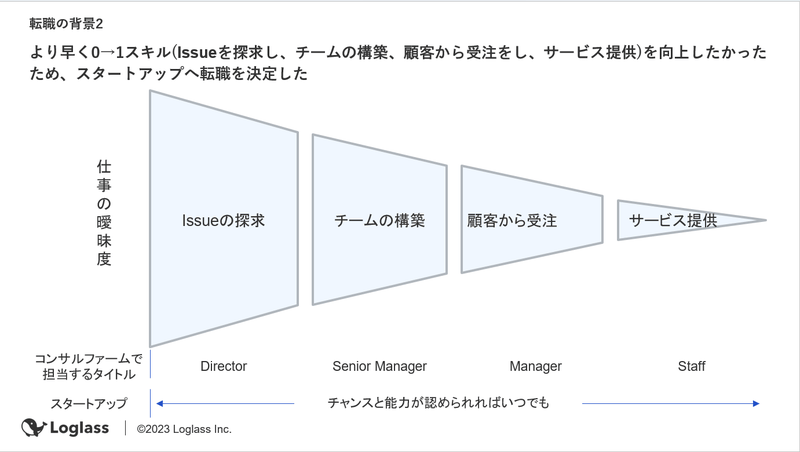 はじめに 初めまして。ログラスの杉崎と申します。 この度は本noteを開いていただき、ありがとうございます。 本noteは、コンサルタントファームでITコンサルManagerをしていた私が、スタートアップに転職しようと思った背景・不安だったポイントを記載し、同様にスタートアップにチャレンジしようとしている人へ情報提供をすることを目的としております。