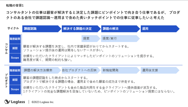 1)タッチポイントの長期化 コンサルタントは基本的にお客様の解決範囲決定がスタートであり、提案or実行がゴールとなります。 結果、解決すべき課題のPriorityに疑問を持ったり、提案/実行した後の運用が気になっても見届けられないケースが発生します。 一方でプロダクトベースの事業会社であれば、運用開始後、顧客の課題認識のスタート地点から運用後の課題解消結果まで併走できます。 プロダクトを通して、顧客への価値提供を仕事としたいと思ったことが、転職企業選定の1点目のポイントでした。