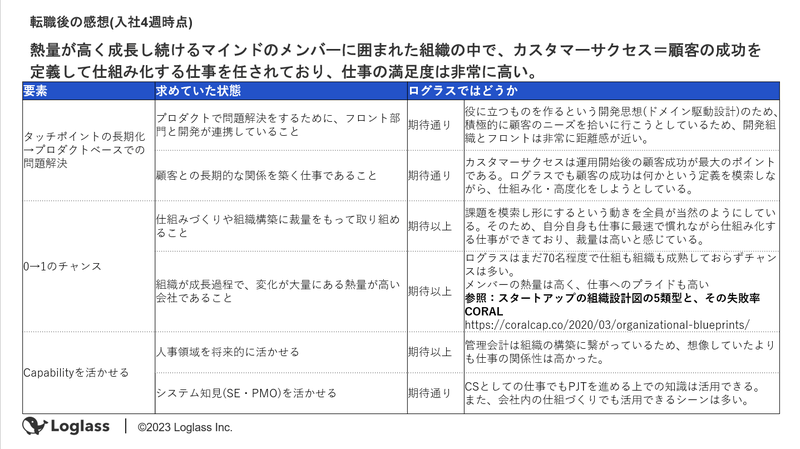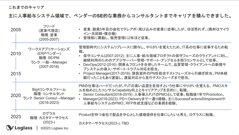 4.最後に ここまでご覧いただき、ありがとうございました。 今後も、CS⇔コンサルのFit&Gap、0→1の体験記、Loglassというプロダクトの良さなどを発信していこうと思いますので、また見ていただければ幸いです。 ログラスという会社への興味、コンサル→スタートアップへの転身に興味がある方はこちらからご連絡ください!