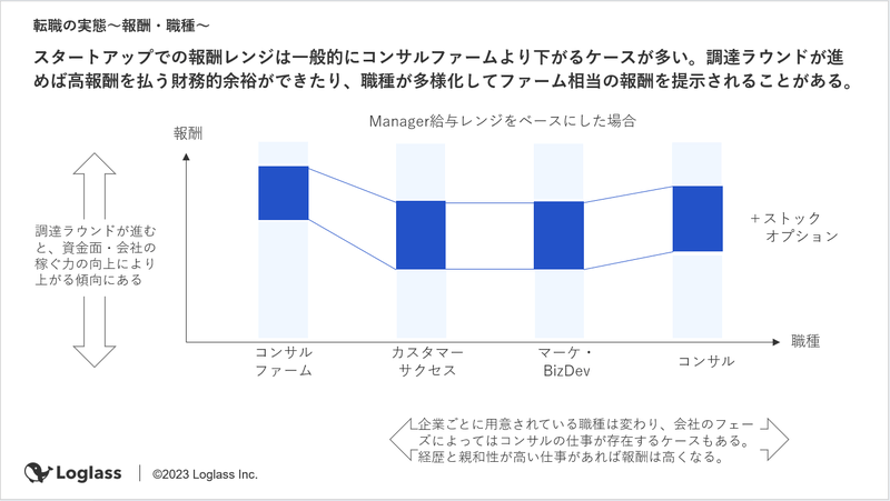 1)報酬・職種 まず最大の関心ごとである報酬についてですが、スタートアップはコンサルファームに比べて下がる傾向が多いと思われます。 スタートアップの中でも調達ラウンドが進む=企業としての成熟度が上がることで報酬自体が上がったり、報酬が高い高難易度の職種が用意されているケースもあります。 また、コンサルタントとしてのCapabilityがFitすれば高いポジションでのオファーも発生し、現行維持~現年収よりも高額といった提示もありえます! 参考: コンサルの「Big4」の年収|ランキング、役職ごとの年収レンジを解説 |コンサルのあんなこと、こんなこと