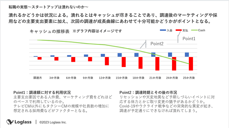そもそもスタートアップとは成長を前提に資金調達をし、赤字で事業投資をするプロセスにある会社の総称です。そのため、成長投資のために増えている支出(人件費・オフィスなど)を賄えるだけの資金調達ができなければ潰れる可能性が高まります。