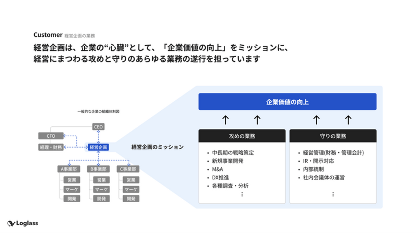 経営企画の役割(参照:ログラス会社紹介資料より|https://speakerdeck.com/loglass2019/whats-loglass) ーーチームの価値観やカルチャーについて教えてください。