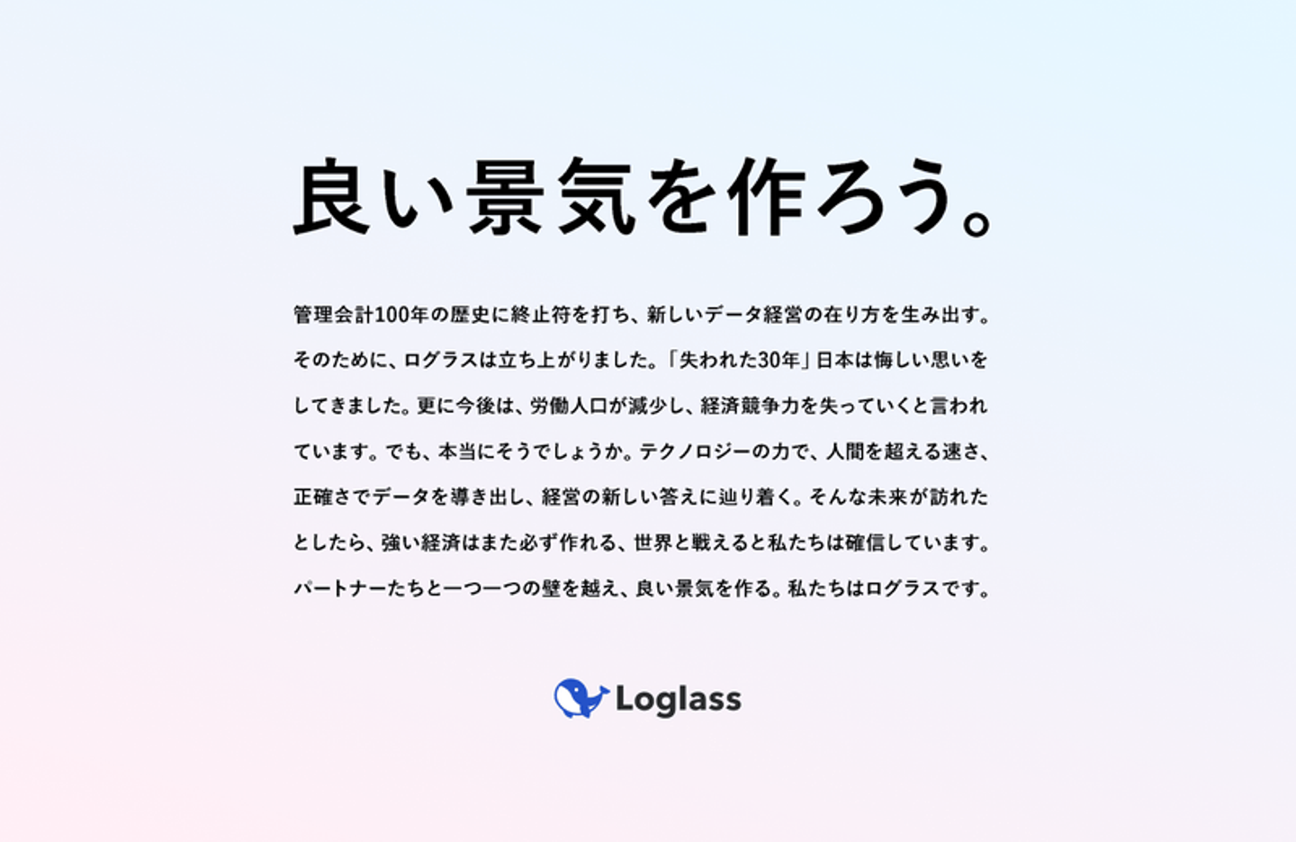人によっては理想的な環境である一方、責任も伴うタフな環境です。その環境に身を置き、一緒に「良い景気を作ろう!」と思える方や「ログラスの成長をリードしたい!」と思える方。チャレンジはとても大きいと思いますが、最高の組織を一緒に作りませんか?