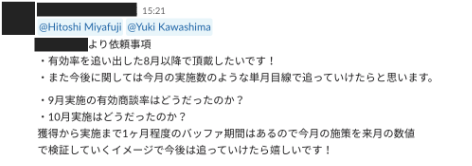 また、毎週の定例においては、「数字の進捗確認」と「良くなっていること」、「改善してほしいこと」などのフィードバックや、具体的な改善策の提供などを行っています。