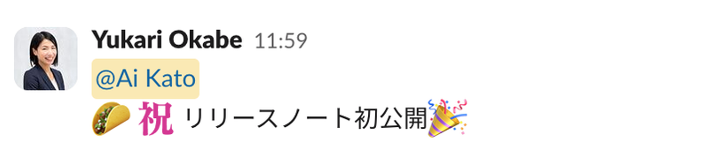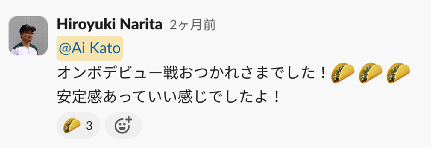 ※こちらは初めてリリースノートを書いた時と、初めてメインで打ち合わせをした時に、周りのメンバーにタコスをもらった様子です