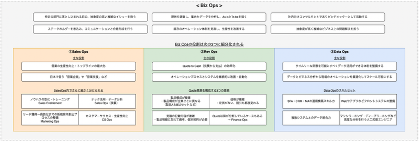 SalesOpsとは営業企画と営業支援を担う役割で、RevOpsは見積もりから支払いまでの効率化。そして、DataOpsはタイムリーなデータ活用と基盤作りに注力する役割です。