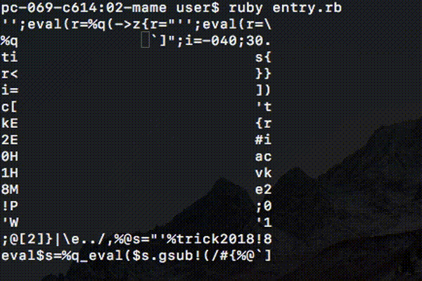 Ruby を用いた超絶技巧プログラミングコンテストの発表です。上記の GIF 画像は、mame 氏作の回転しながら自身を出力するコードです。入賞したコードは https://github.com/tric/trick2018 で取得することができます。発想も技術もおもしろく、理解の範疇を超えた驚くようなコードが次々と発表され、会場も湧いていました。
