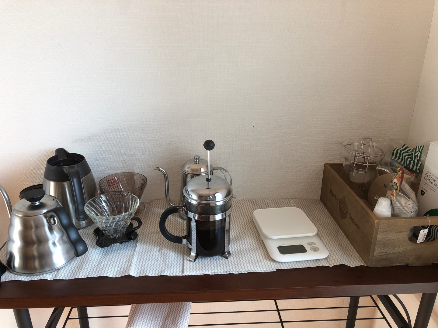 本当は、お菓子を置くための棚なのですが、ついにコーヒー器具に占拠されました。