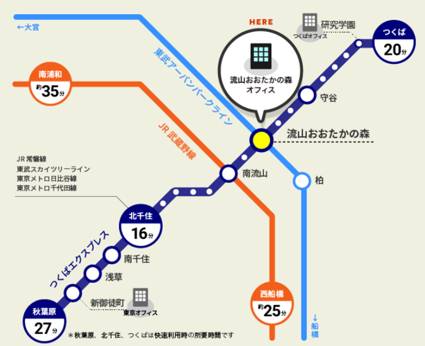 流山おおたかの森オフィスは、つくばエクスプレス線「流山おおたかの森駅」から徒歩1分の好立地にあります。