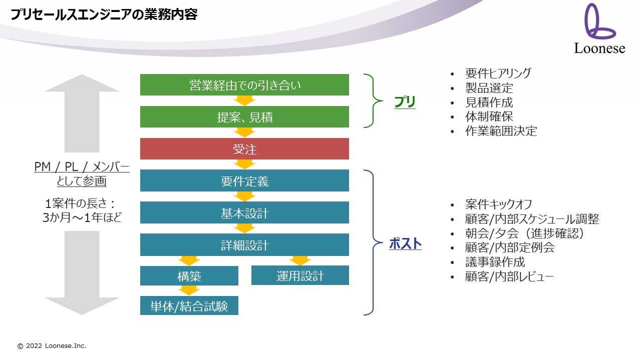 プリセールスエンジニアの業務は大きく分けると"案件を受注するまでの提案(プリセールス)"と"受注案件の推進(ポストセールス)"に分けることができます。
