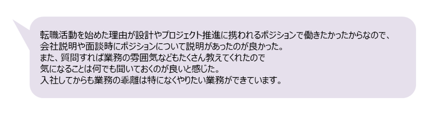 弊社では、会社説明時から面談まで現役のエンジニアが対応するので「聞いていた話と違う!」というような入社後の業務内容の乖離は一切ありません。