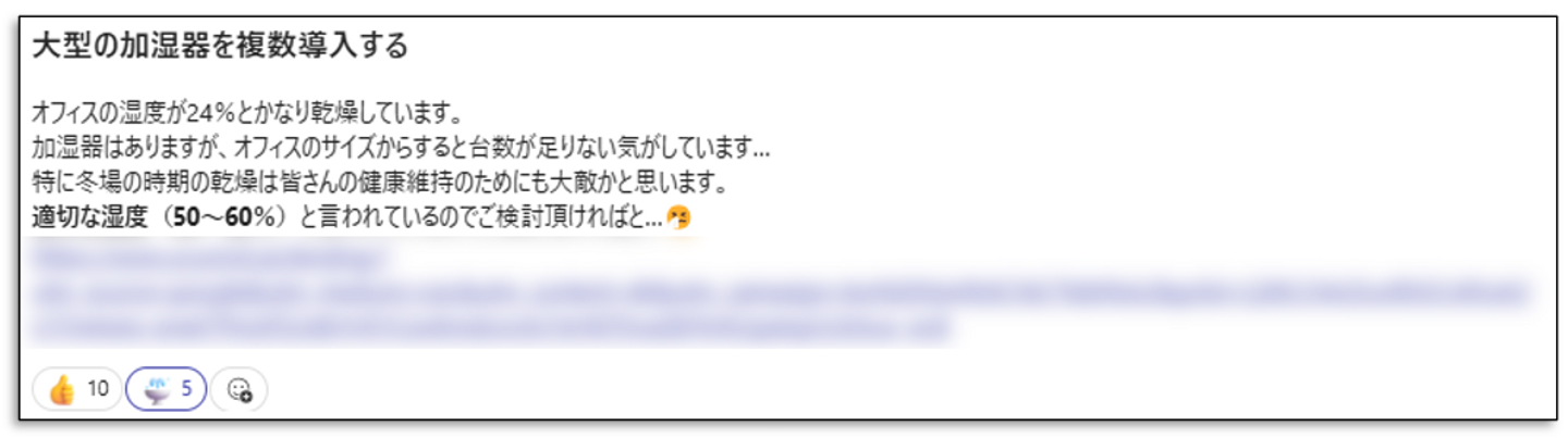 たとえば、新しいオフィス備品の設置というアイデアであれば、総務チームと人事チームで話し合い、導入可否を決めます。