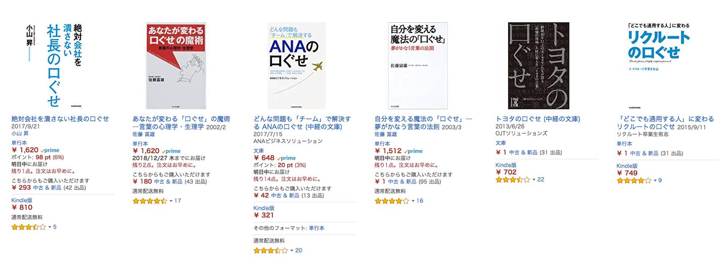 実際にAmazonで「企業名 + 口ぐせ」と検索すると、名だたる企業の「口ぐせ」に関する書籍がヒットします。