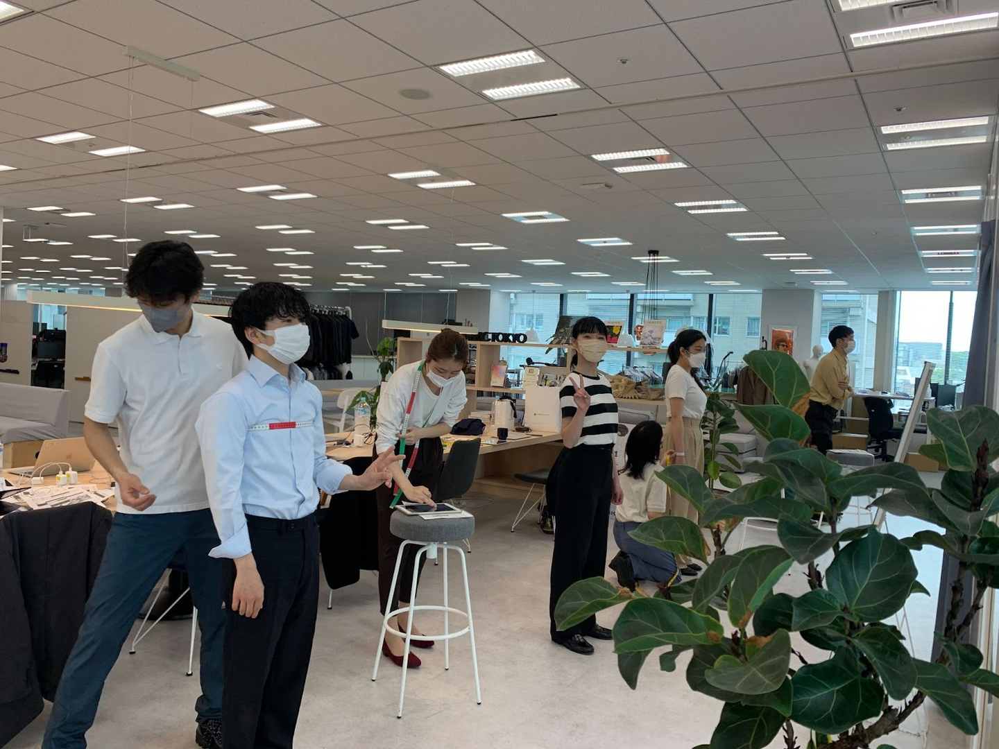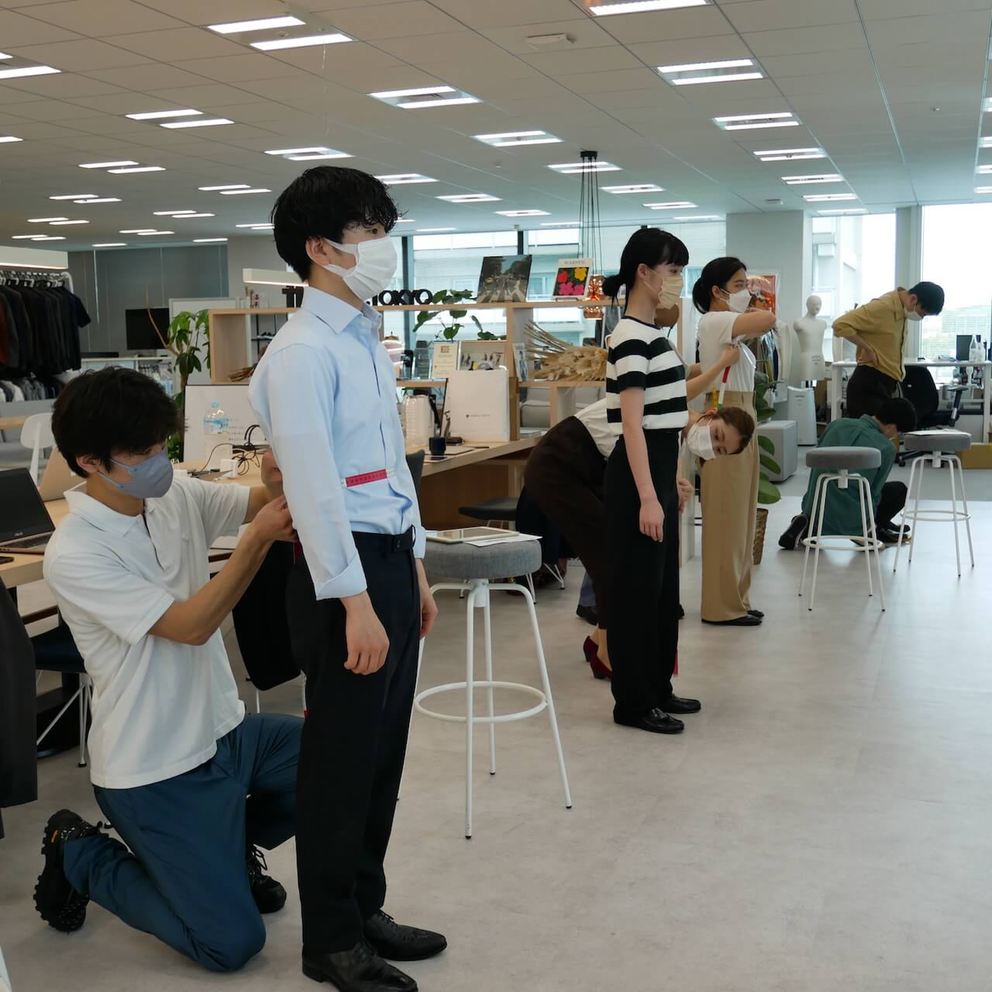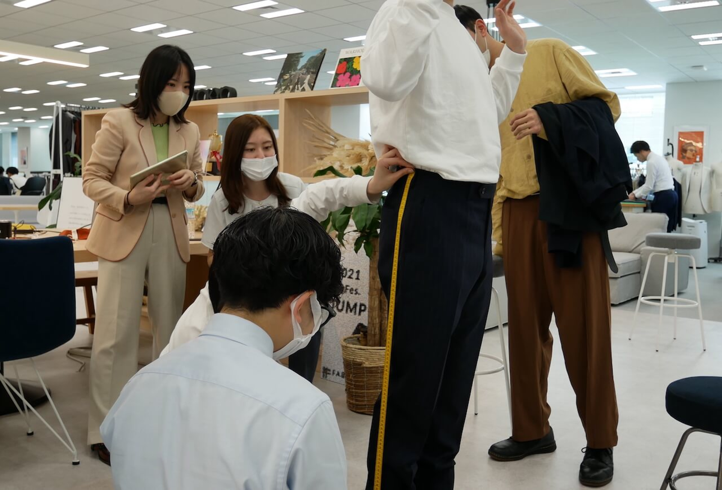 原宿オフィスは、オフィス内で研修ができるように設計されているので、採寸研修をすると写真のような感じになります!(同期の高本さんがピースしてくれてます✌️)