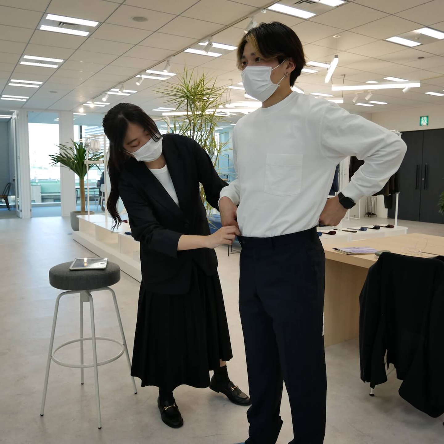 研修最終日には、研修を実施してくださっている先輩社員を採寸し、実践形式のテストを行います。このテストに合格しないと、正式にコーディネーターとして店舗に立てないので、先輩社員も私たちも緊張感がありました。