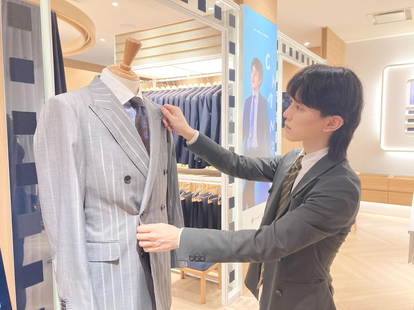 2020年新卒入社の中澤です。現在は店舗でコーディネーターとして働き、オーダースーツやシャツなどの採寸やお客さまに合った生地のご提案を行っています。