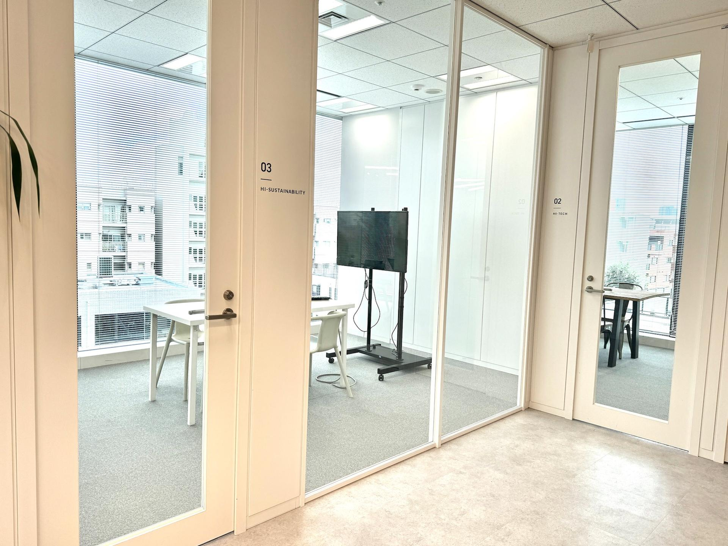 会議室はすべてガラス張りで「オープン」を体現しています。