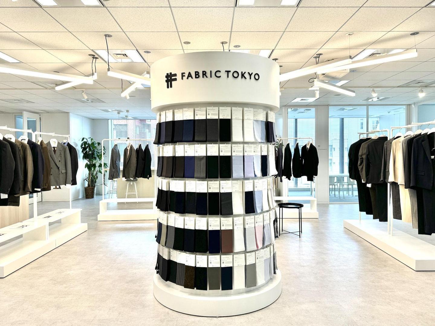 入り口を入るとすぐにスーツやシャツの生地が並ぶ柱「ファブリックピラー」がお出迎え。