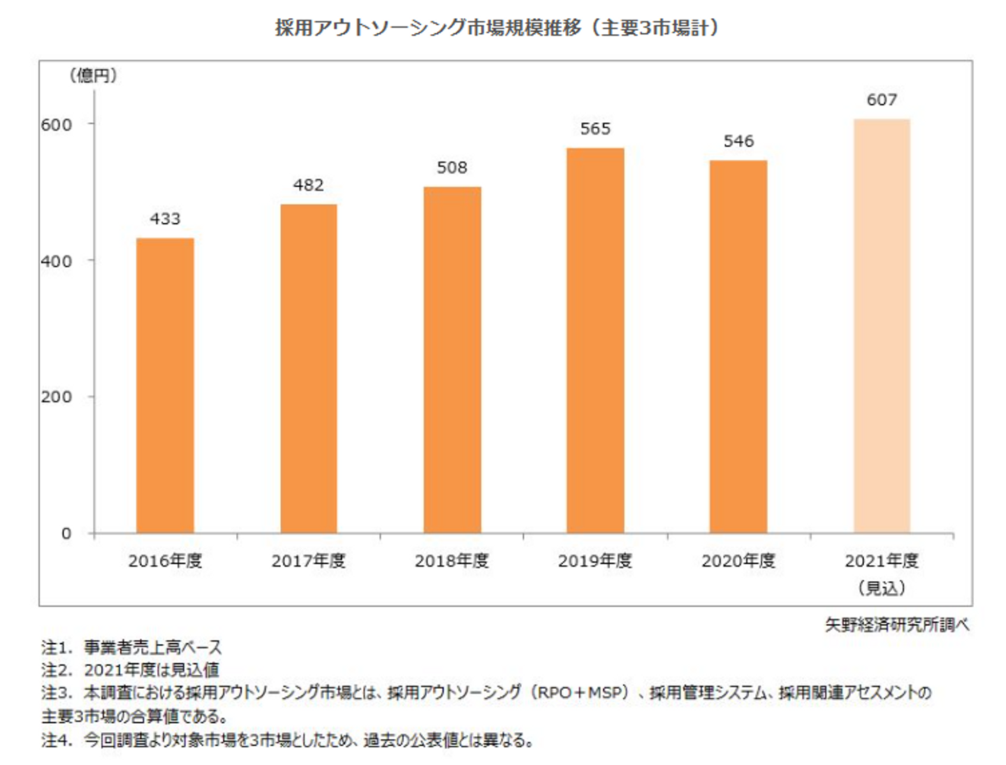 RPOサービスの需要は年々拡大しており、市場規模は2020年度の546億円から2021年度には607億円へと成長しました。今後もさらなる拡大が見込まれています。