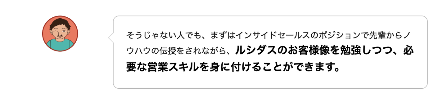 バリバリにSaaSのアカウントエグゼクティブ(AE = 営業)をやっていて、ソリューション販売なら任せてください!という方なら、ルシダスのサービスの売り方を覚えつつ即戦力での活躍が見込めます。