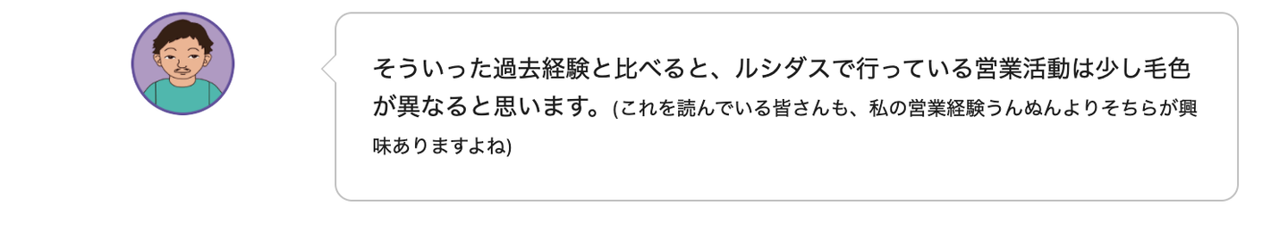 これまでにご説明したように、ルシダスには独自の営業手法や、ルシダスで求められる営業スキルが存在します。そのため、これまでの営業経験がそのまま役立つ方もいれば……そうでもない方もいます。(笑)