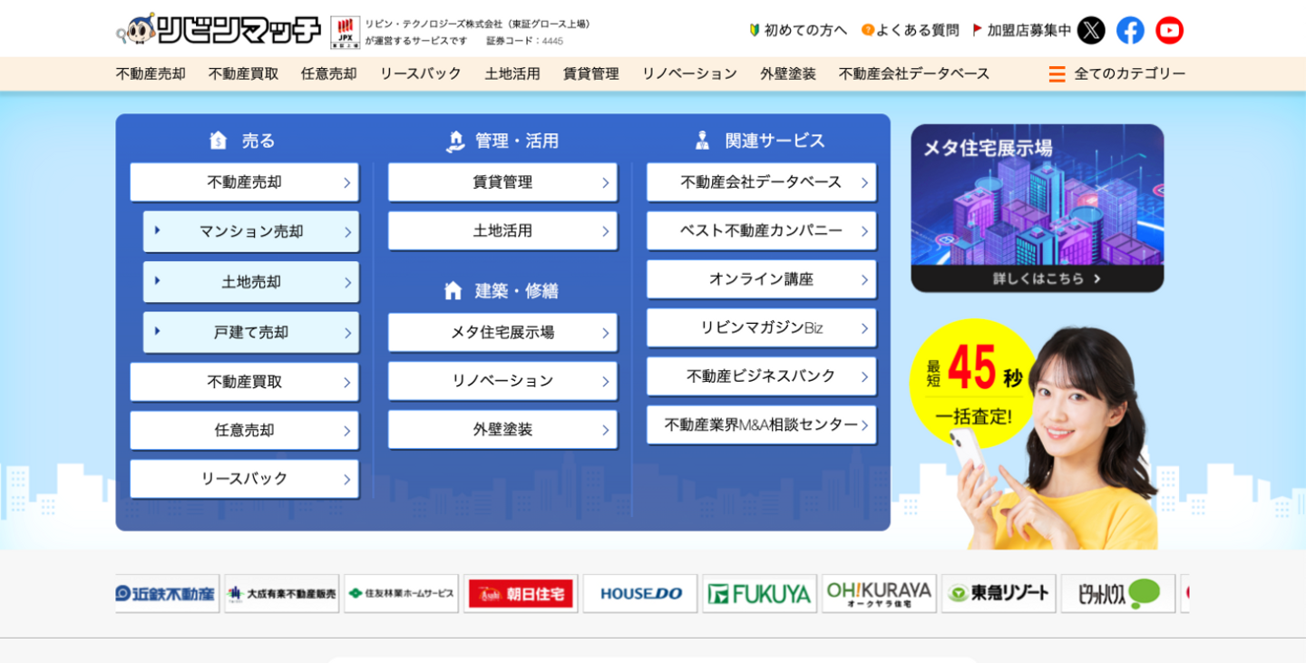 不動産の売却を検討しているユーザーと、専門的な知識を持つ不動産会社をマッチングするサービスです。