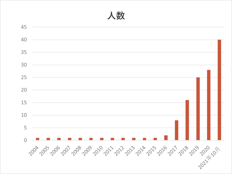 リクネク、エン転職、Wantedlyといった求人サイトや、弊社ブログ・SNSを見て、面白がってジョインしてくれるメンバーが少しずつ加入し、2021年10月現在で40名となりました。(2020年はコロナで採用活動を少し様子見したので伸びが少ないです。)
