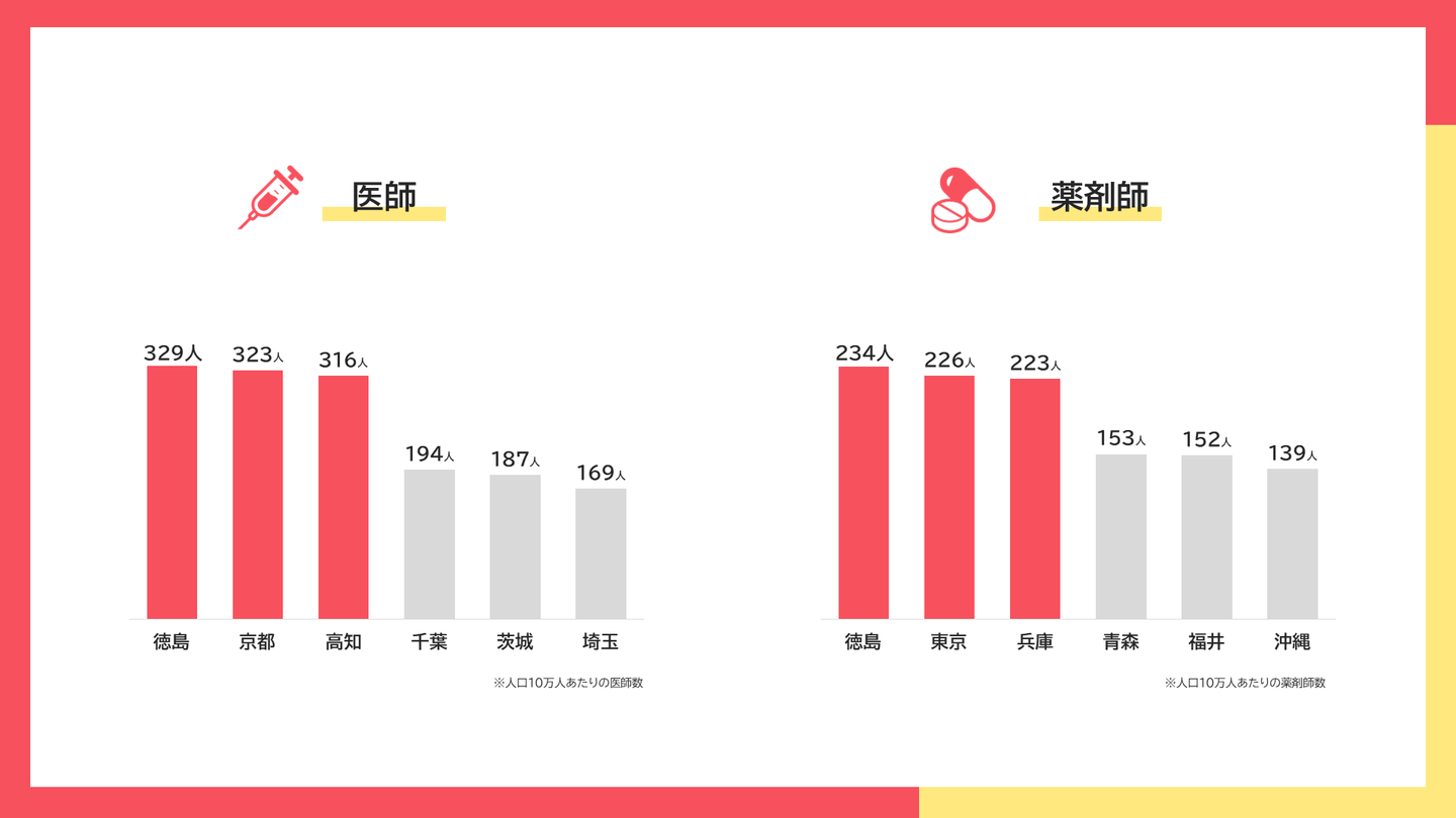 薬剤師に関しても同様の傾向がみられており、徳島県や東京都のように薬剤師が過剰になっている地域もあれば、沖縄県や福井県のように不足している地域もあります。