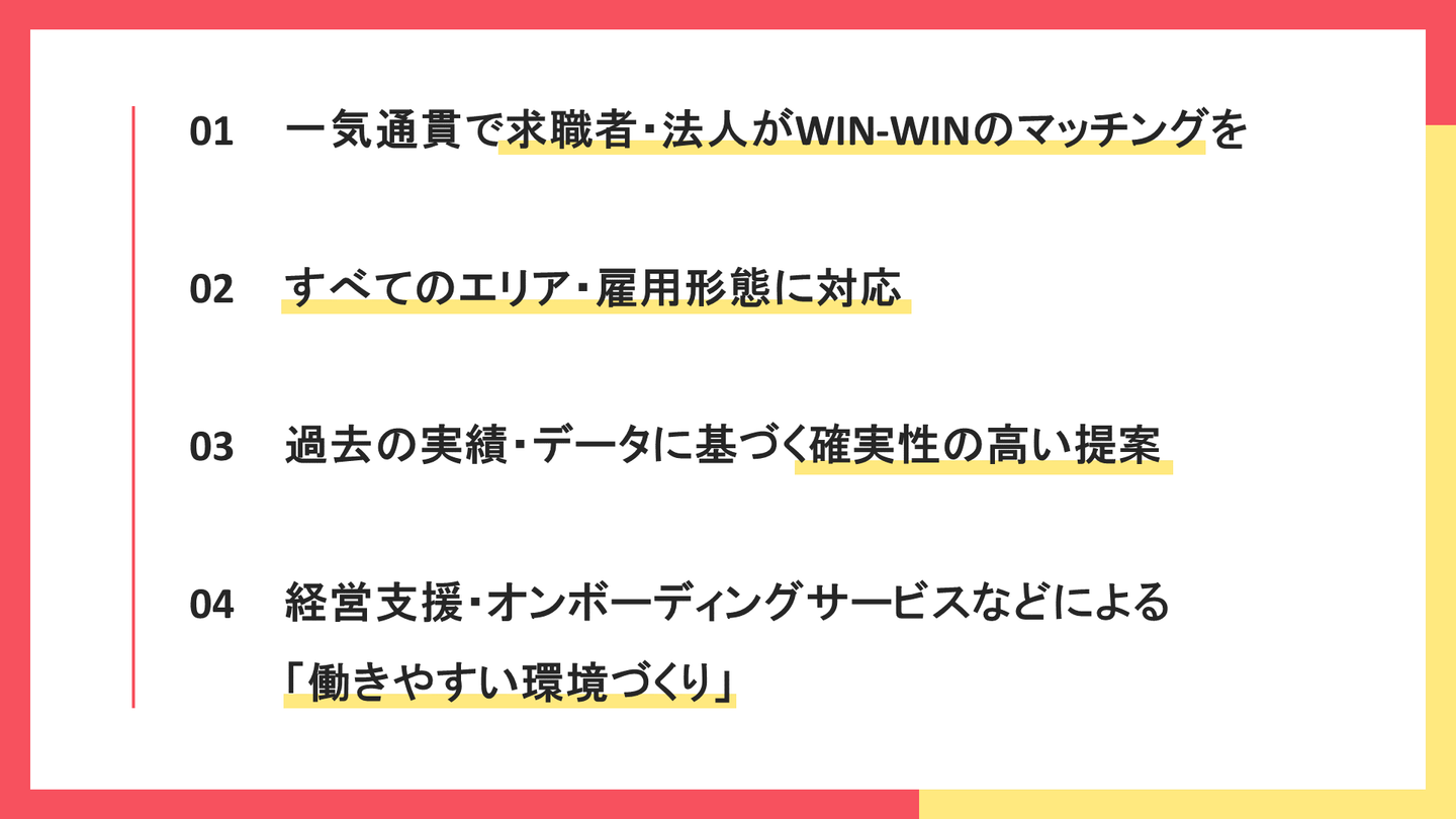 1.一気通貫で求職者・法人がWIN-WINのマッチングを
