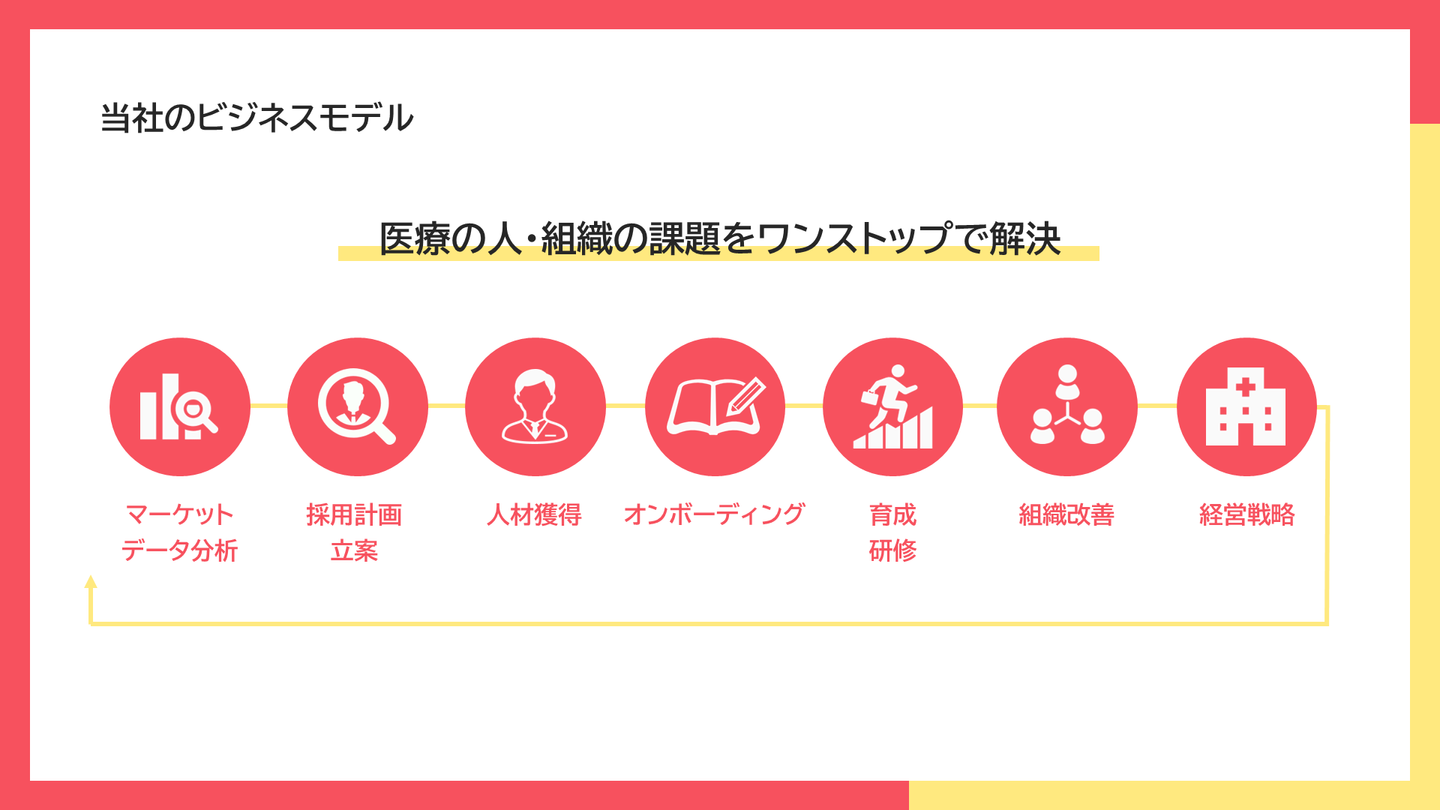 当社は、求職者にとっての「転職」・医療機関や企業にとっての「採用」の場面だけに関わっているわけではありません。例えば、転職をした人がいち早く組織に馴染めるようなオンボーディングのサービスを提供したり、収益改善のコンサルティングを通して、病院が健全に、且つ安心して患者さんに医療を提供できる環境づくりをサポートしたりしています。