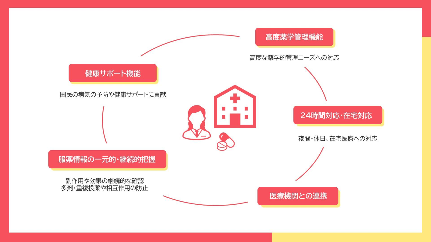 この図は、厚生労働省の資料を参考にしたものです。国は医療政策の中でも薬局・薬剤師の在り方を定めていて、一般的にみなさんがイメージする「処方箋を受け取って、正しく処方し、患者さんが正しく服薬できるようにする」だけでなく、特にここ数年の間で様々な役割を期待されるようになりました。
