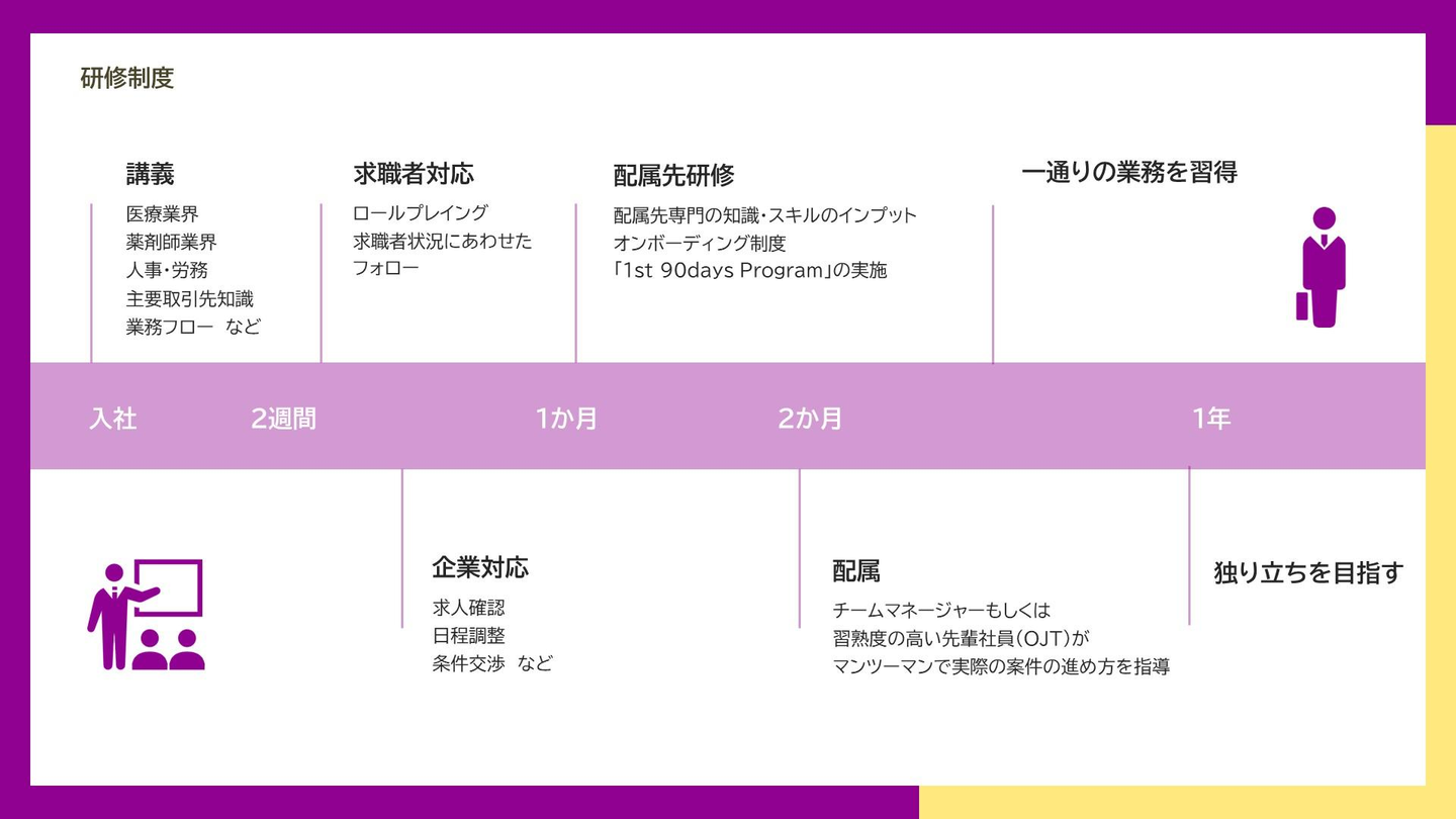 エムスリーキャリアでは、入社~独り立ちまでをサポートする制度はもちろん、社員の成長フェーズ・役割に応じて多様な研修制度を設けています。