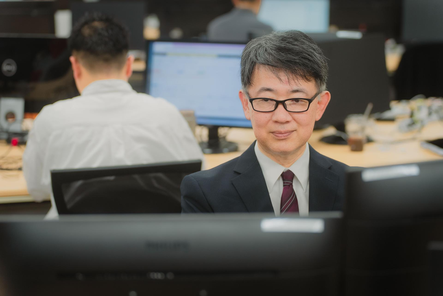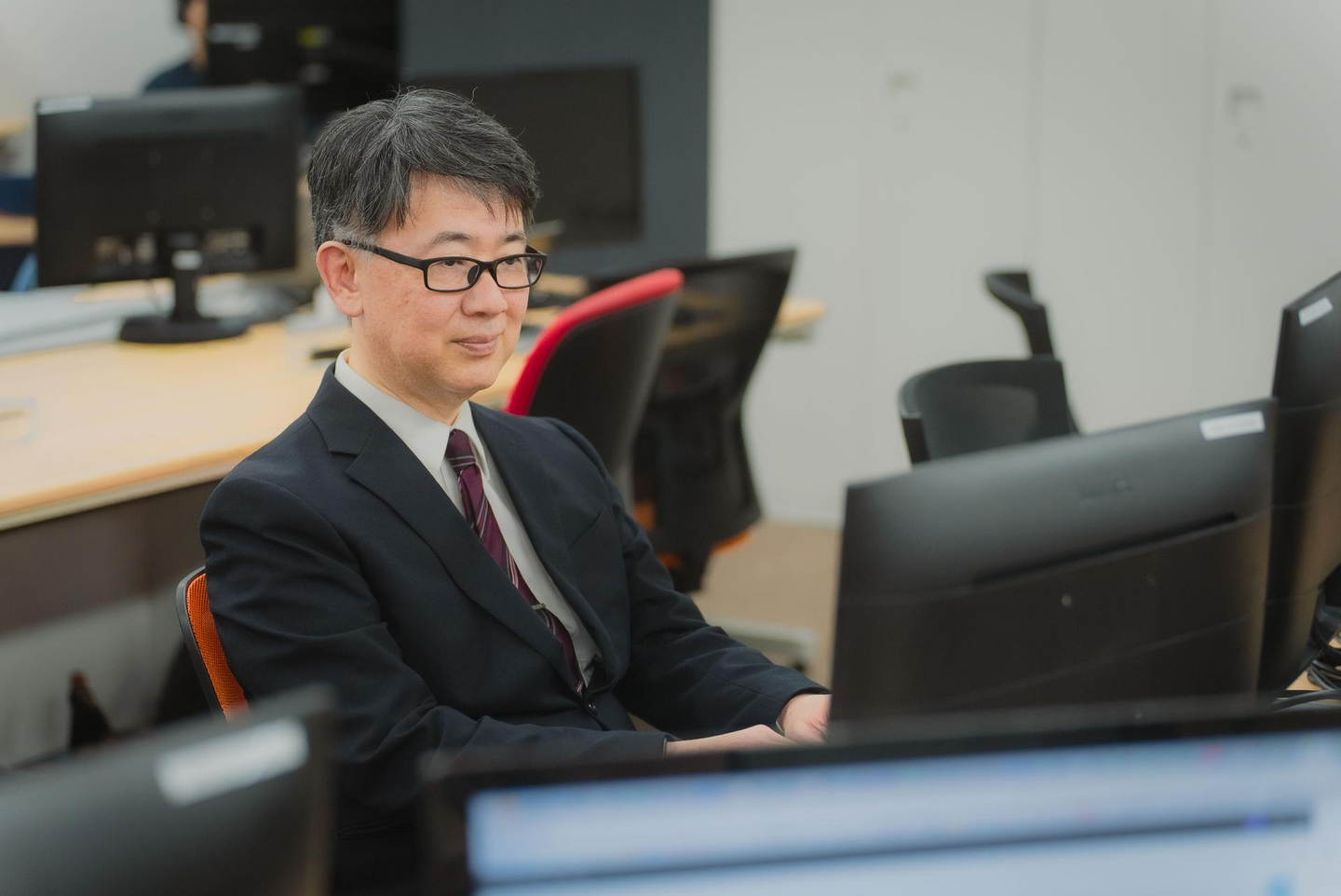 S.K)情報システムは、上位の管理者権限を持つクリティカルな部署です。自分に対しても厳しくなければいけないと思っているので、襟を正す意味を込めて、勤務中はスーツを着ています。過去の就業先でもスーツ着ているのは私だけ、というような場面も多かったのですが、自分のワークスタイルを貫いています(笑)