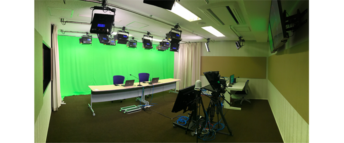 黄緑のカーテンは背景合成するためのものです。お客様の要望をもとに、様々なデザインのスタジオセットを演出することが出来ます。
