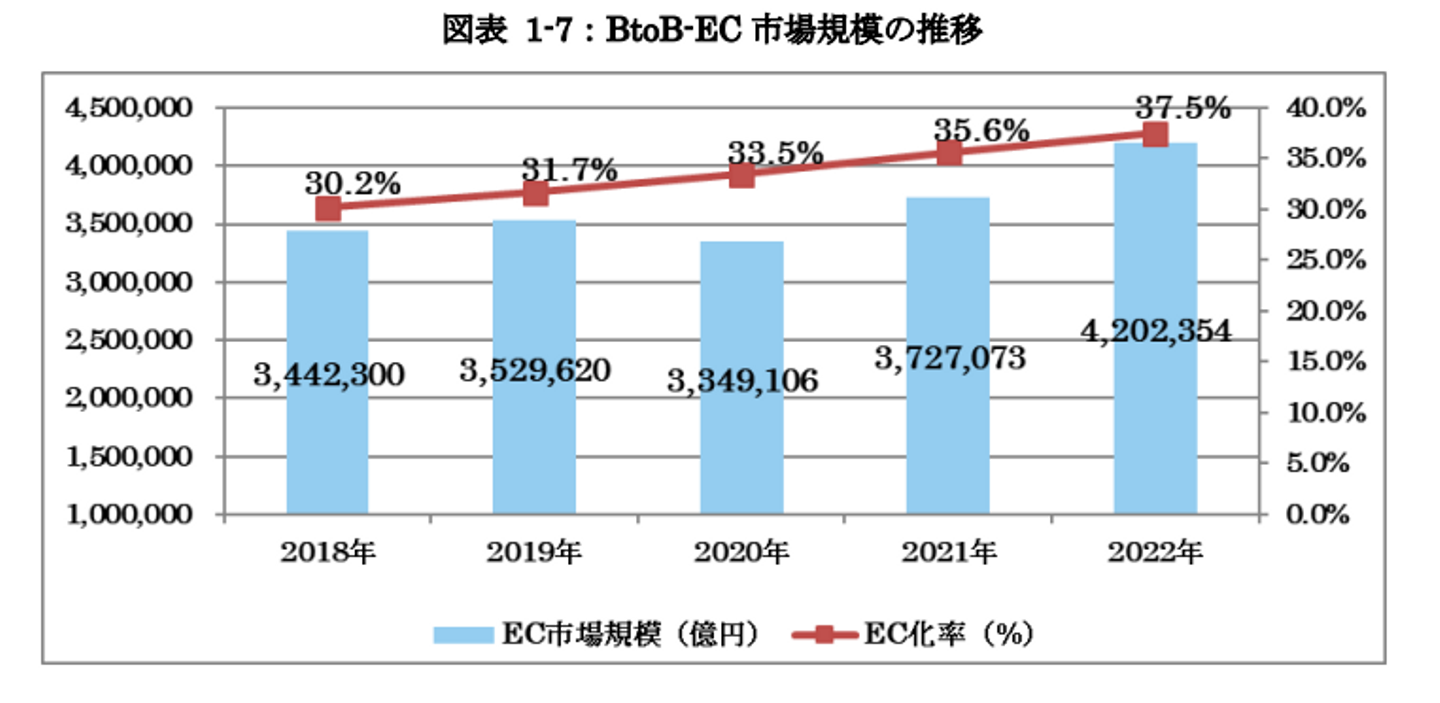EC化率は、全商取引の中でECが占める市場規模の割合を指します。この指標は、特定の市場や国におけるECの普及度を測るために使用されます。例えば、2022年のデータに基づくと、BtoBの37.5%が製品やサービスの売買をネットで行っていることになります。