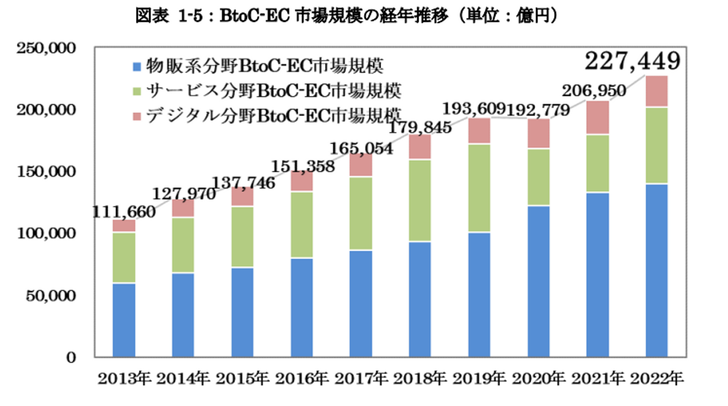 経済産業省の調査によると、2022年の国内BtoC EC市場の規模は約22兆7,449億円に達し、前年比で2兆499億円の増加を記録しました。この成長は、消費者のオンラインでの購買行動が拡大していることを示しています。
