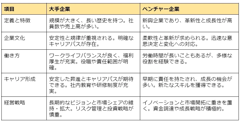 まずは、大手企業とベンチャー企業の特徴を簡単に整理してみましょう。