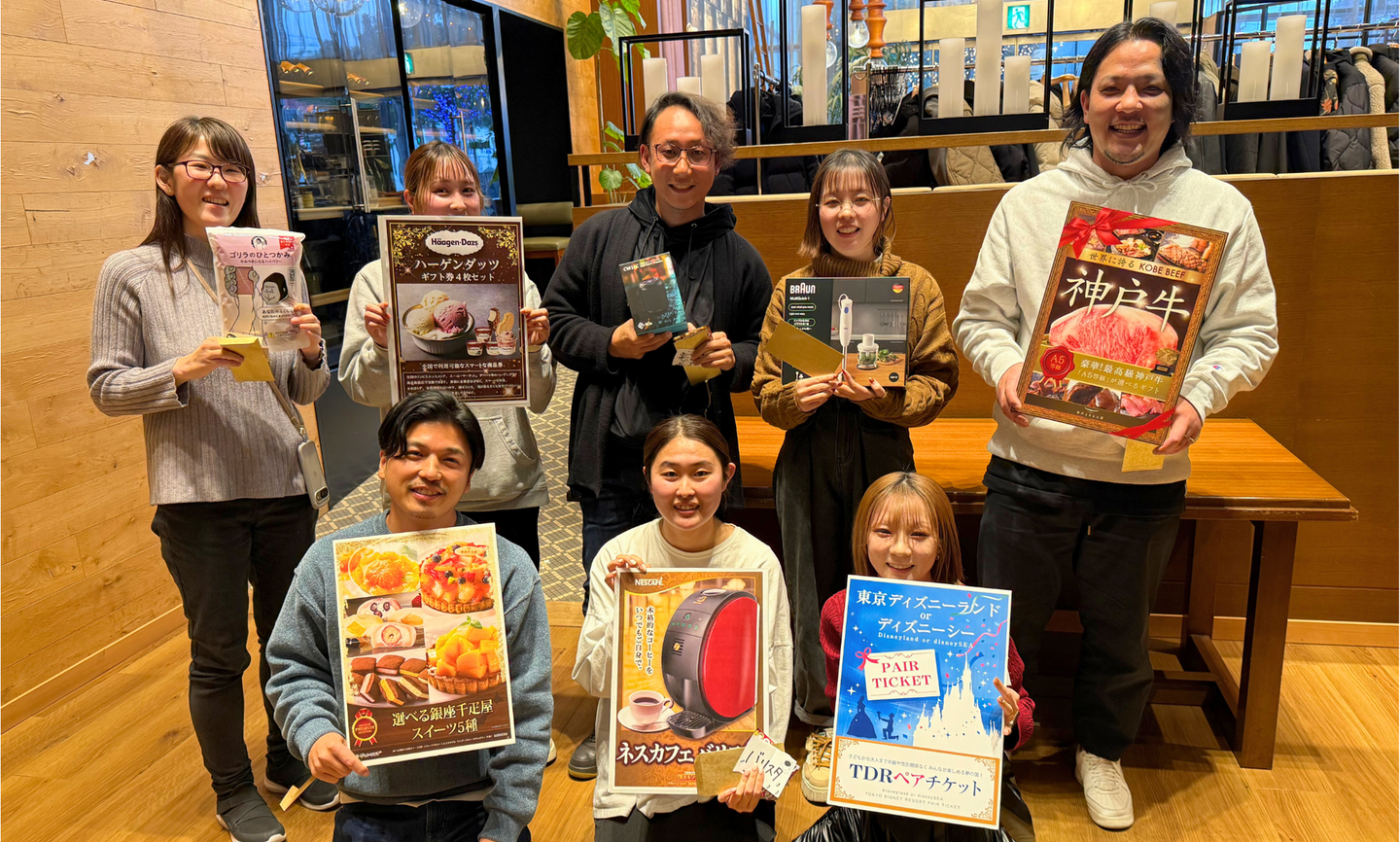 他にも、神戸牛やハーゲンダッツ引換券など、豪華な景品がずらりと並び、どれも魅力的なものばかりでした。景品が発表されるたびに歓声が上がり、参加者全員が最後まで楽しめるイベントとなりました🎁