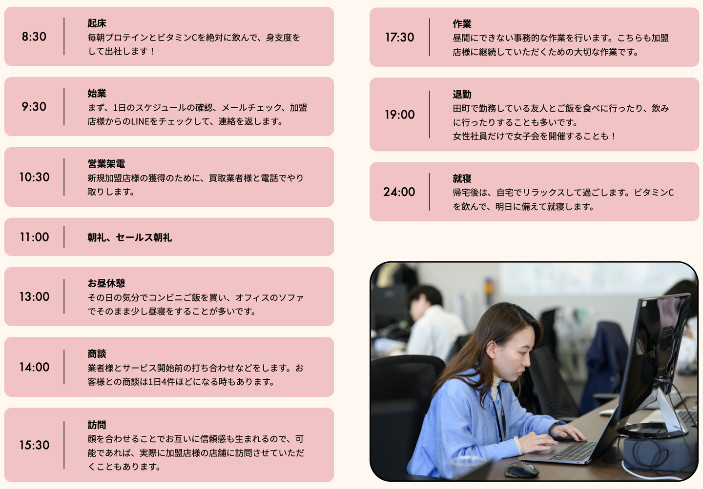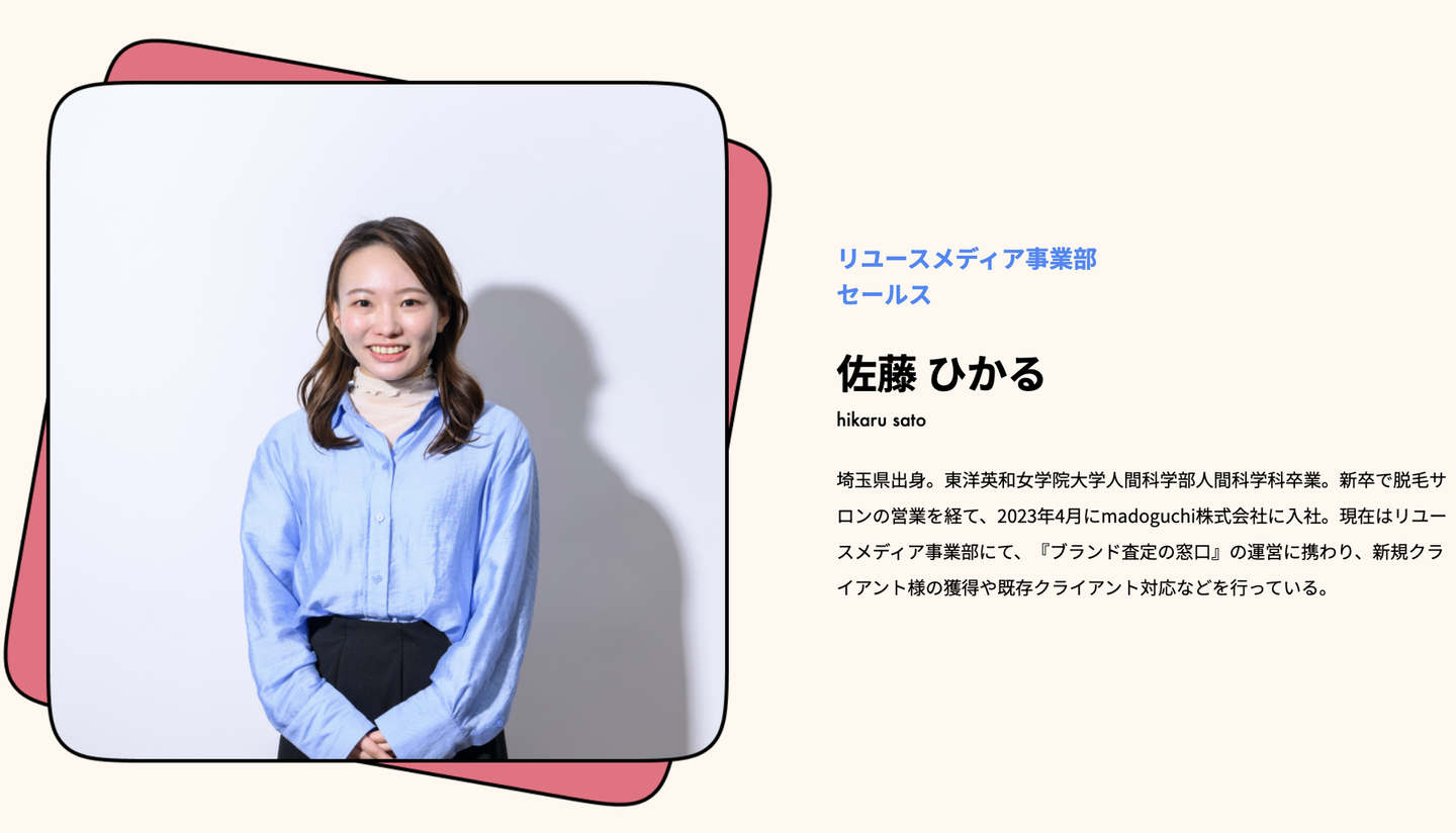 私はもともと脱毛サロンでtoC向けの営業を行っていたのですが、法人営業がしたいという思いがあったため転職活動を行いました。その中でmadoguchiの思いに触れ、一緒に上場を目指す仲間として頑張っていきたいと思い入社しました。