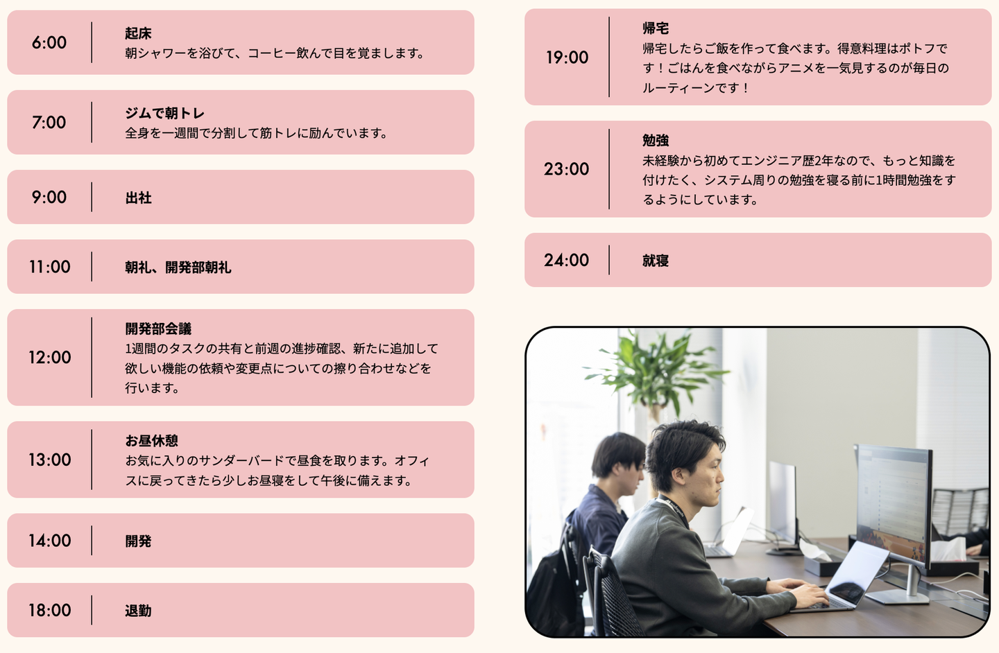 今はとにかく人数が少ないので、インフラ関係の部分から実際のアプリケーション開発、バックエンドもフロントエンドも一気通貫で経験できるので、スキルが身に付くし、色々な経験ができます。また、マーケティングやデザインの方にも関心があれば、その知識を自分でシステムに落とし込むことができるので、今後のキャリアの幅はより広げていける仕事だと思います。今後も新メディアがたくさん出来ていくので、任されればサーバ周りの開発から全部1人で携われるので、ひとつのことだけに拘らず、経験したいという方にはぴったりだと思います!